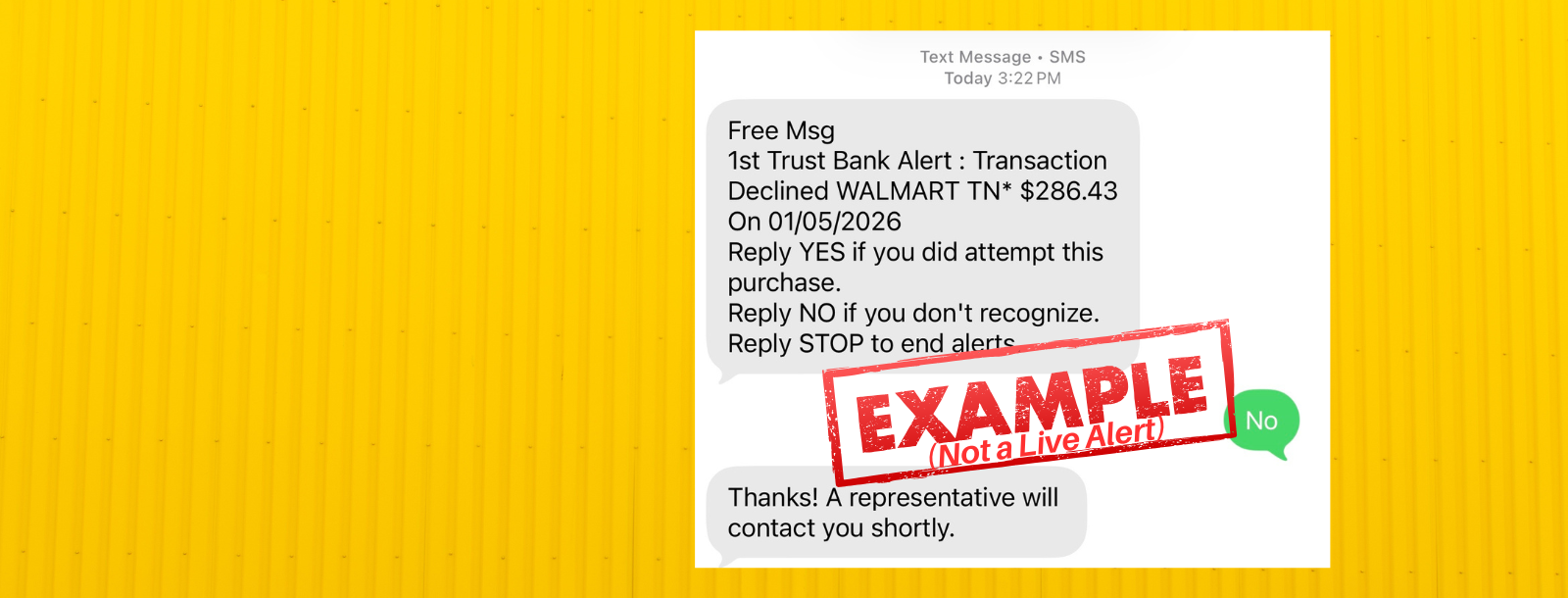 1st Trust Bank does NOT currently use a fraud alert system where you receive a text message for a declined transaction with further prompts of communication.